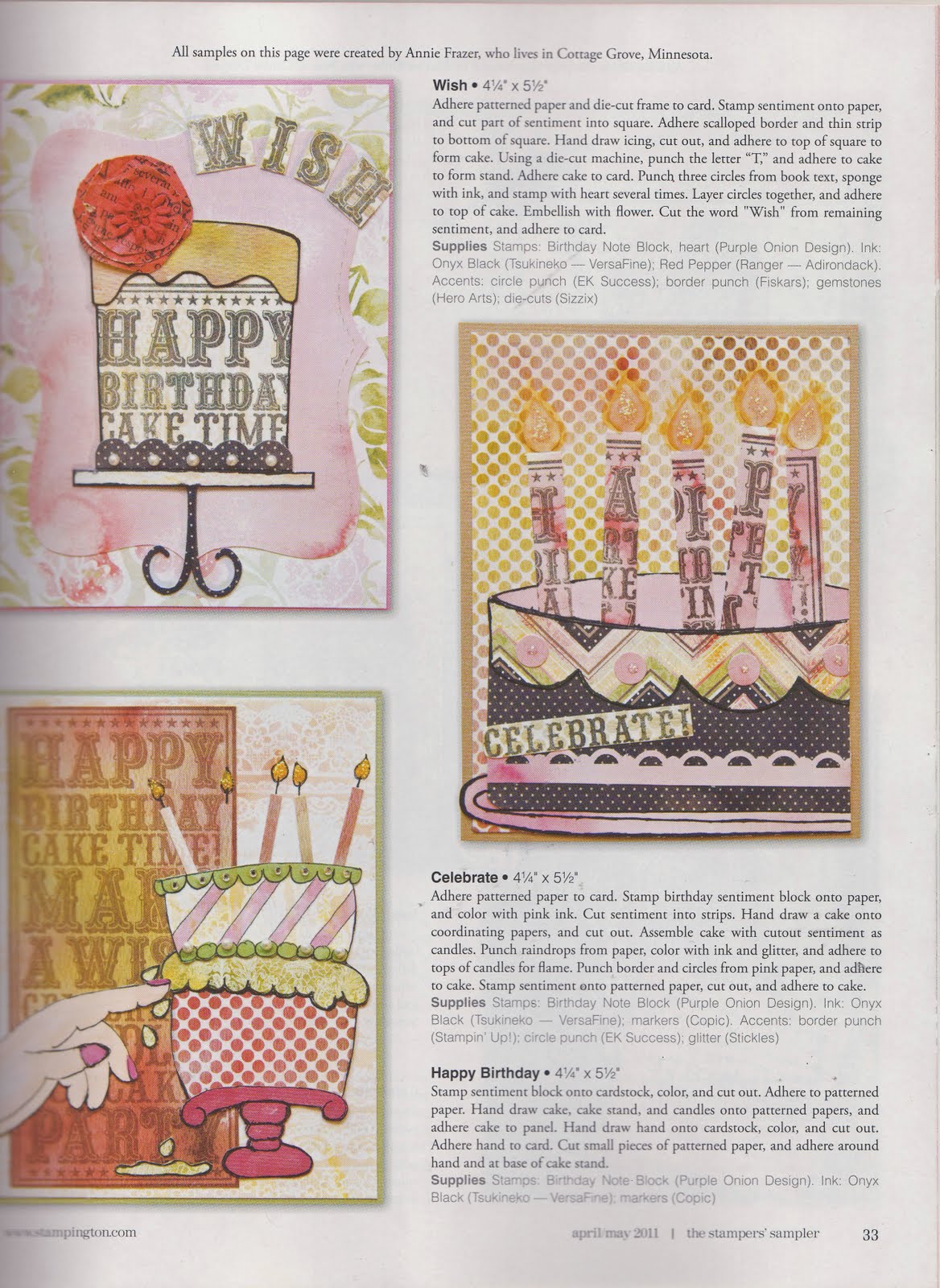 Awhile back I did some cards using Purple Onion Designs Birthday Note Block. I drew up the cake so that there was nothing else stamped but what I could pull from the Note Block. I submitted the cards to Stamper's Sampler for their Different Point of View section and was thrilled to find out that they had picked them up. I have put the pictures from the magazine as well as pictures of the cards themselves for you to see.